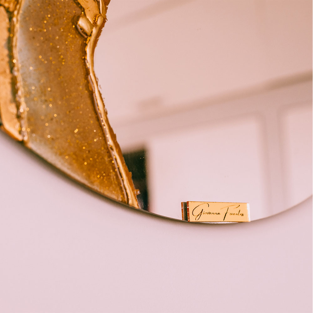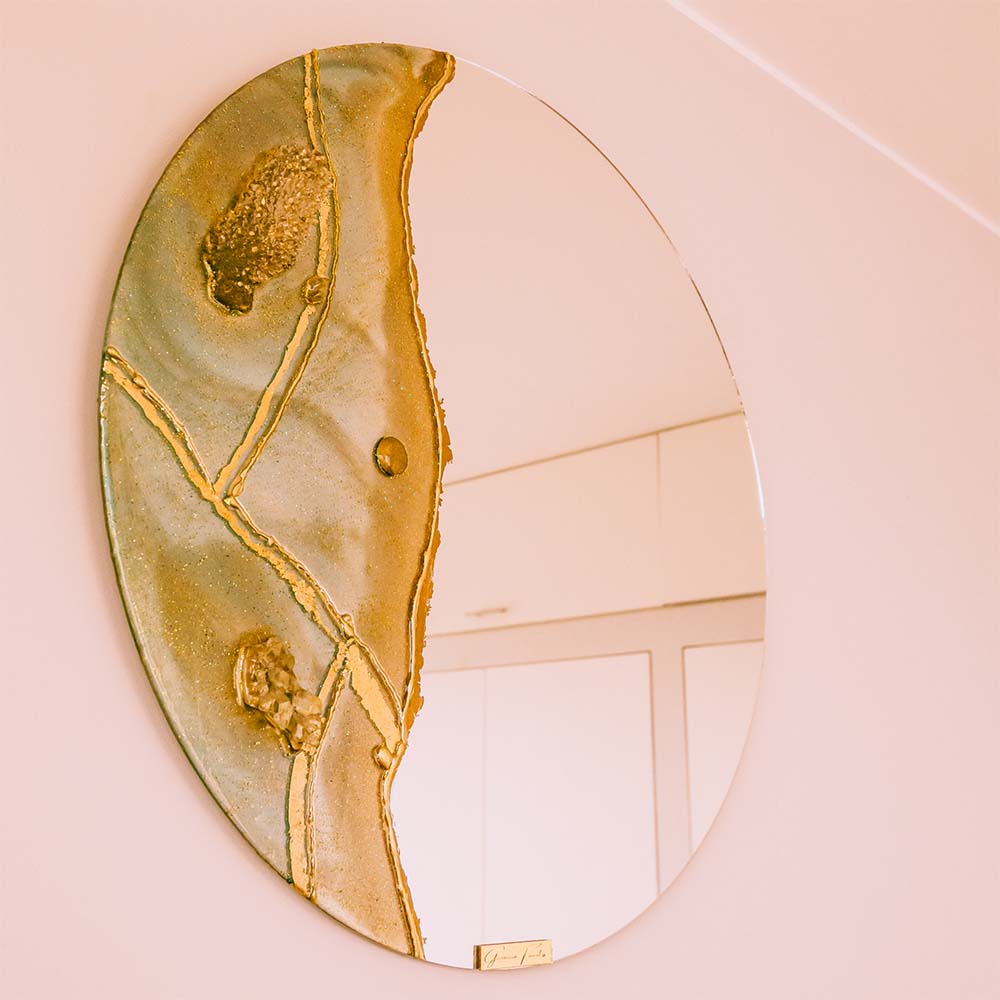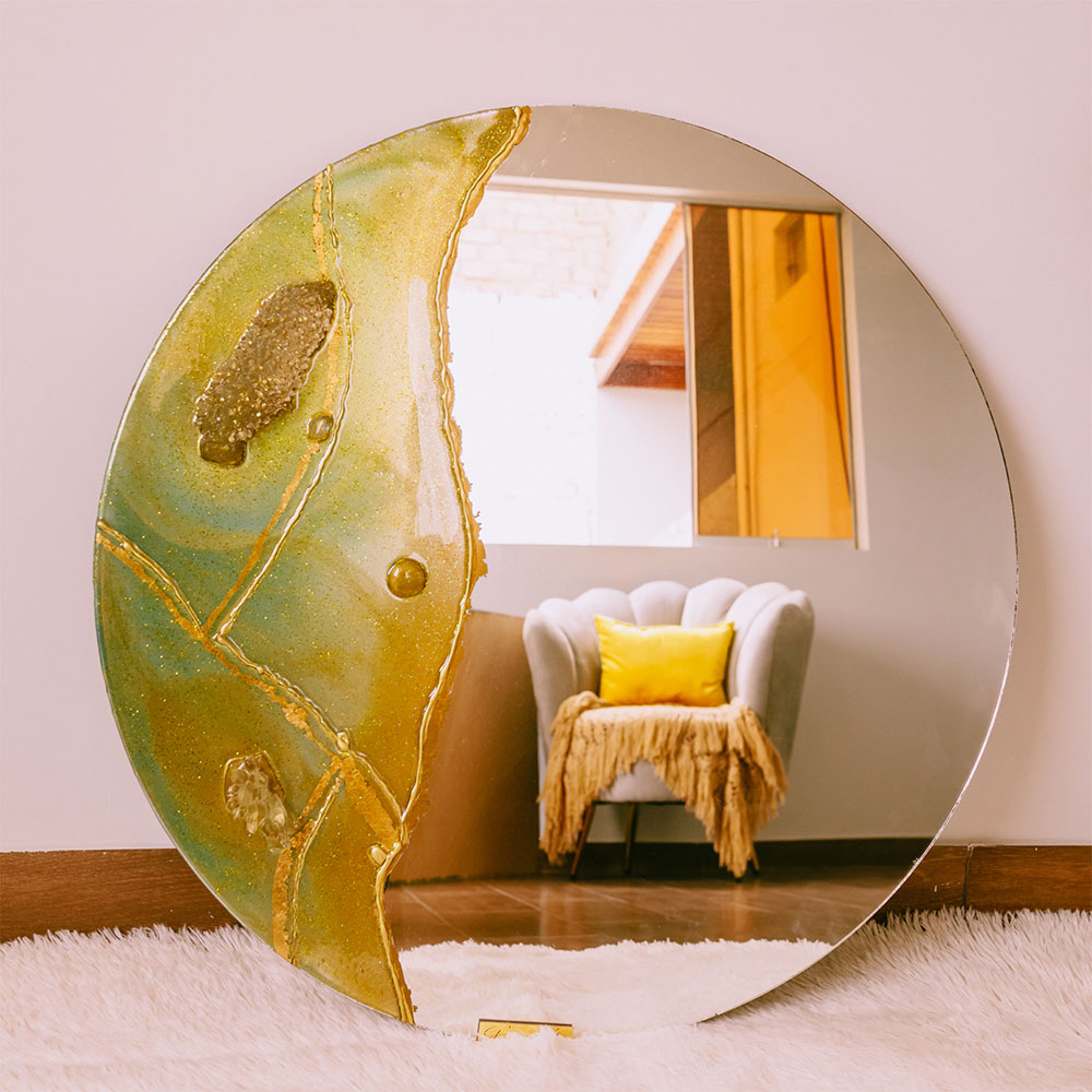 Tablas de quesos a colores Verde y dorado hecho de resina para irradiar Equilibrio del ser, de medidas 40cm x 25cm.
